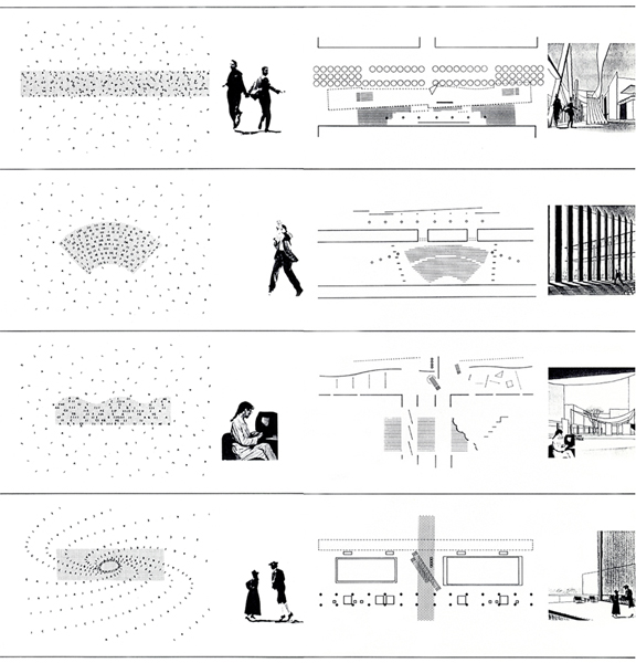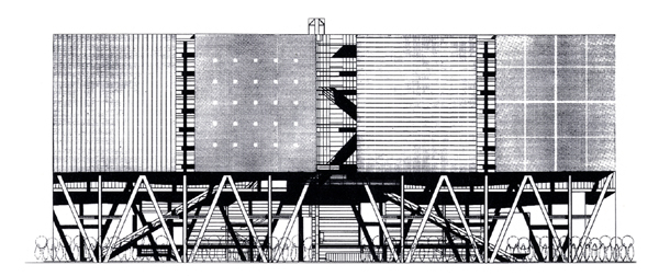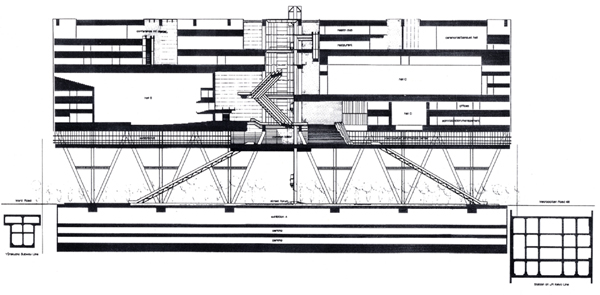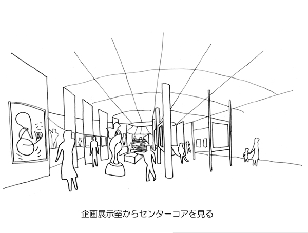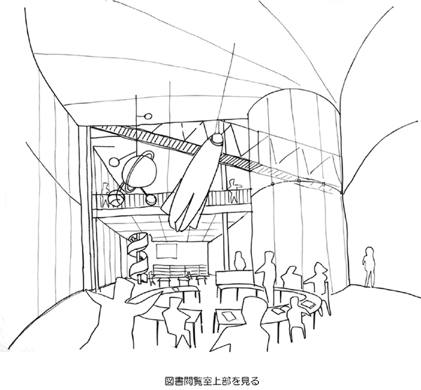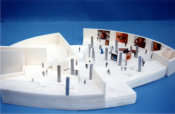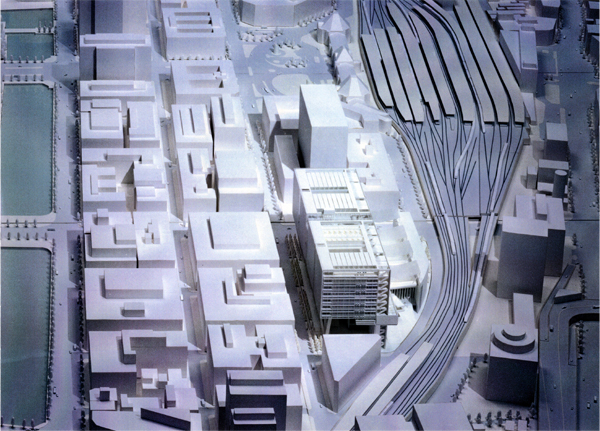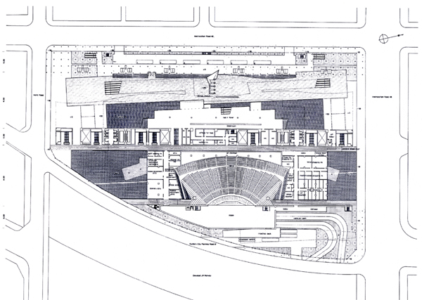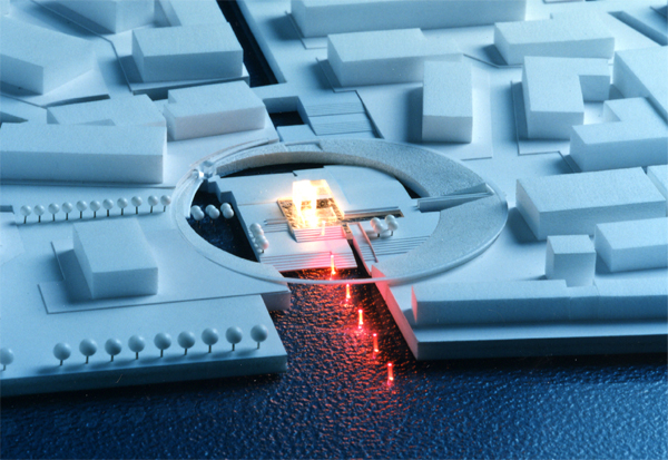 有楽町・東京都庁跡に建つ複数のホール群からなる施設の国際設計競技応募案。必要な施設はコンパクトにまとめ、その箱(メインフォーラム)を地上から大きく持ち上げた。そして開いたピロティをもう一つのフォーラムと位置づけ、都市に開くことで施設の“顔”を作ることを構想した。