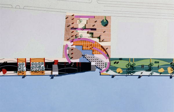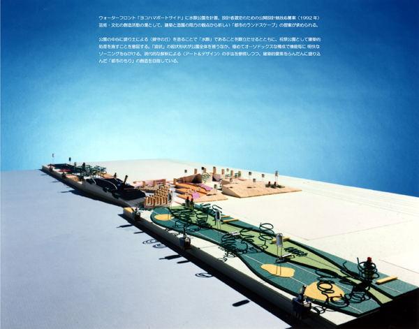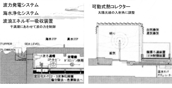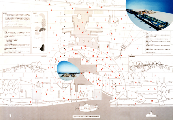 現代の都市における「トポス」の回復の手段として、銭湯の再評価と新しい場所性の構築が求められた。潮入庭園を海辺に作り、フリーマーケットでコミュニティの再生を促しながら、夕闇迫る頃、灯篭流しのようにガラス貼りの風呂が海面と一体化する環境・眺望の変化を期待する・・・そんな情景に現代の祝祭のイメージを重ね合わせた案である。