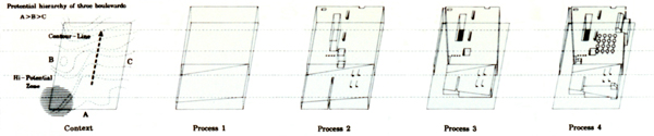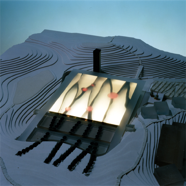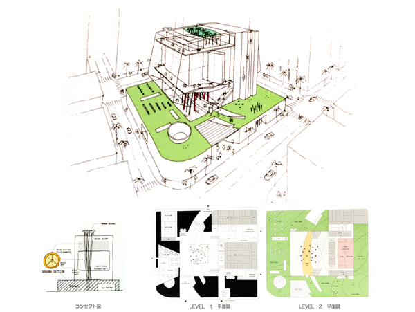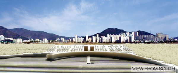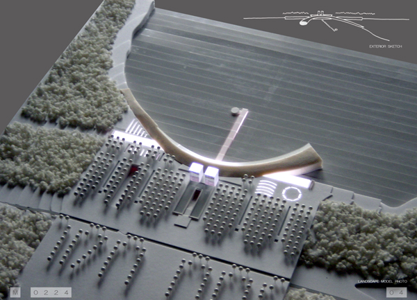 アメリカ・ロサンジェルスの韓国タウンに建設される、米韓の文化交流の拠点として韓国文化を広く情報伝達することが目的の芸術文化センター+美術館の国際設計競技応募案。[セミファイナル13選・Exhibition Entry] 〈風の丘を越えて〉と題された自案は、当時韓国で大ヒットした映画のタイトルをそのまま借用している。