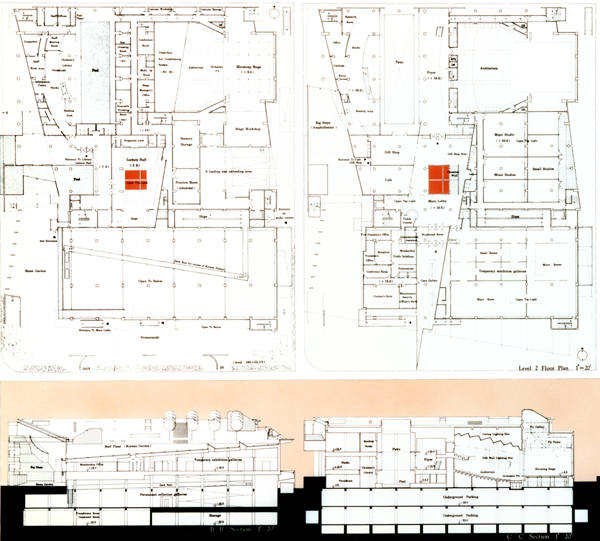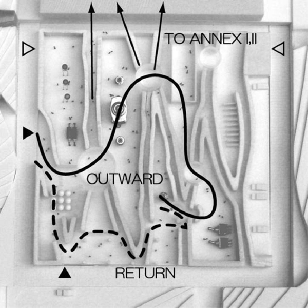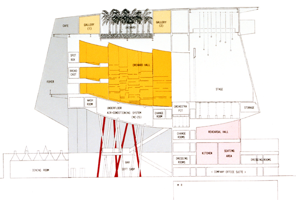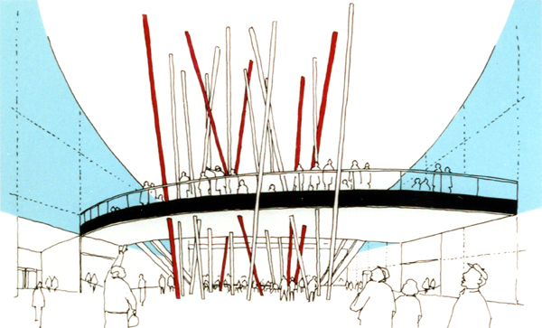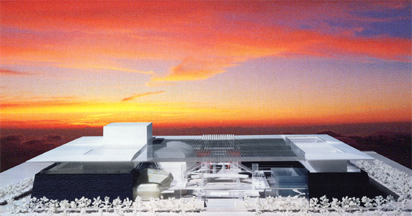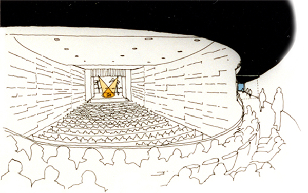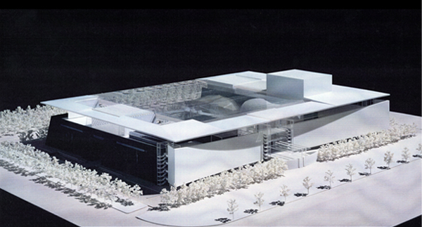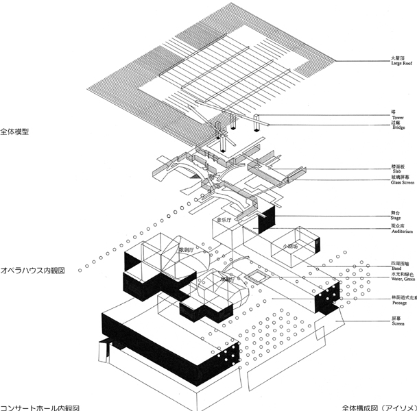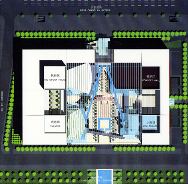 オペラハウス、劇場、コンサートホール、小劇場の必要4施設を背中合わせに配し、その中心に四合院ならぬ、“五合院”の開放的なフォーラムを作り出した。そしてそれらの施設に国家権力の象徴としてのシャープな大屋根を架ける提案をした。